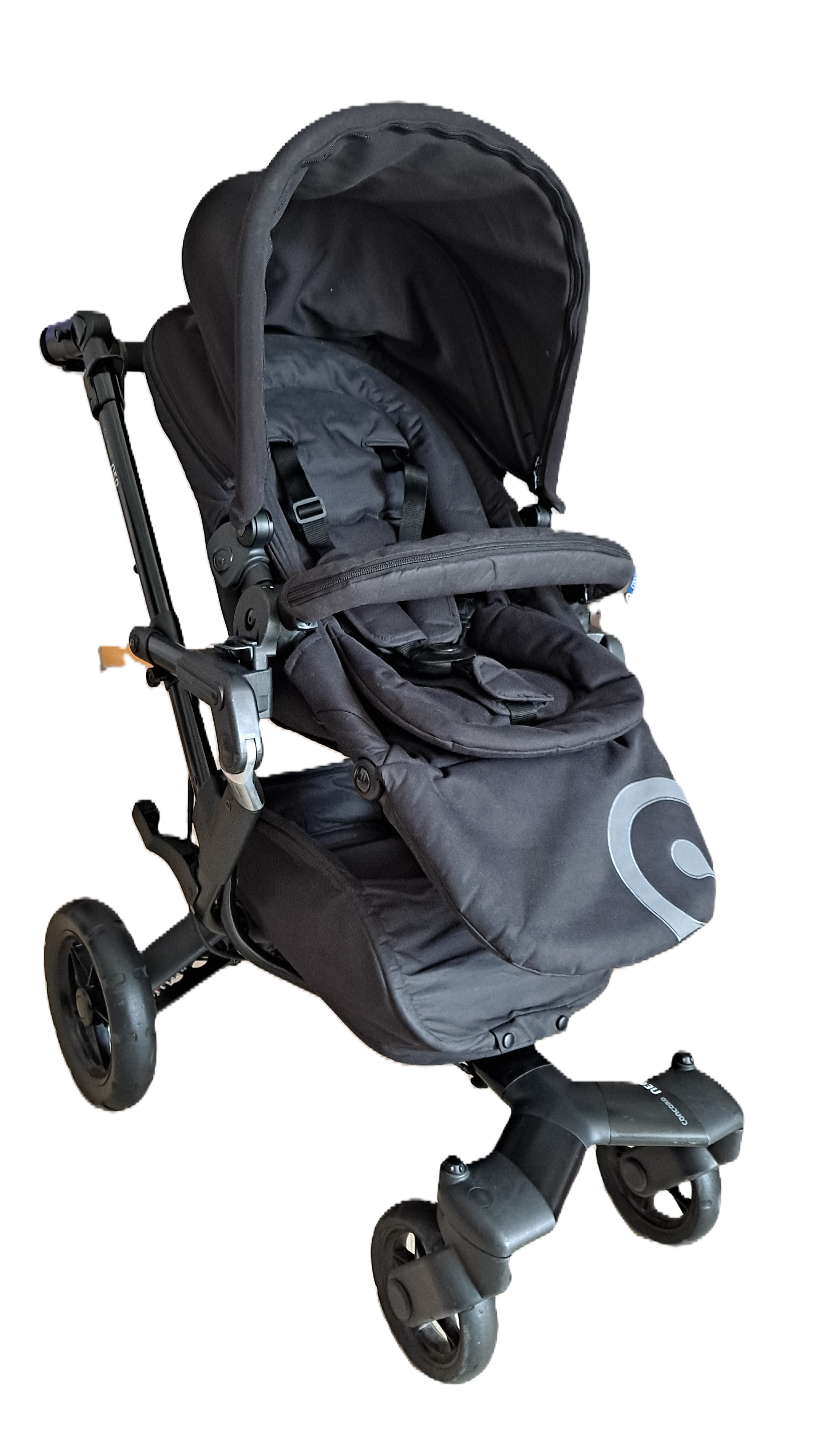Fecho do chassi com e sem o assento instalado. Travão “Stop & Go” junto à pega no topo. Assento reversível, virado para quem empurra o carrinho ou de frente para o sentido da marcha. Suspensão de torção central e independente em cada roda, aumentando o conforto dos passeios. Barra frontal com protecção contra o vento (integrada). Punho regulável em altura para melhor se adaptar a si e à sua condução. Capota ajustável e com protecção anti-UV 50+, resistente, impermeável e facilmente lavável. Cinto de 5 pontos, com fecho de segurança. Ajuste de inclinação do banco com 4 posições, sendo uma delas totalmente deitada. Bolso grande nas costas da cadeira para transportar todo o tipo de objectos. Tecidos respiráveis, mais resistentes, ou extra confortáveis conforme a zona.